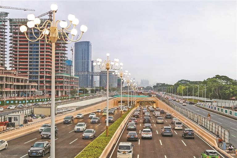 昨日下午,滨海大道(总部基地段)交通综合改造工程下沉隧道主线正式建成通车。图为傍晚时分,车辆有序进出隧道。