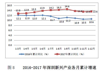 全年全市新兴产业(七大战略性新兴产业和四大未来产业)实现增加值9183.55亿元(已剔除行业间交叉重复),增长13.6%,比上年提高3.0个百分点,占GDP比重达到40.9%,比上年提高0.6个百分点。其中,新一代信息技术产业增加值4592.85亿元,增长12.5%;互联网产业增加值1022.75亿元,增长23.4%;新材料产业增加值454.15亿元,增长15.1%;生物产业增加值295.94亿元,增长24.6%;新能源产业增加值676.40亿元,增长15.4%;节能环保产业增加值671.10亿元,增长12.7%;文化创意产业增加值2243.95亿元,增长14.5%;海洋产业增加值401.45亿元,增长13.1%;航空航天产业增加值146.64亿元,增长30.5%;机器人、可穿戴设备和智能装备产业增加值639.64亿元,增长15.1%;生命健康产业增加值98.12亿元,增长19.5%。