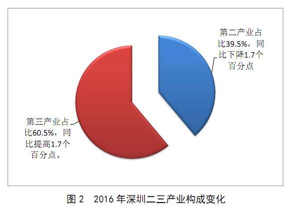 二三次产业结构由上年的41.2:58.8调整为2016年的39.5:60.5,三产占GDP比重比上年提高1.7个百分点,首次突破六成。第二产业中,工业增加值7190.86亿元,增长6.8%;建筑业增加值525.32亿元,增长9.0%。第三产业中,批发和零售业增加值2103.05亿元,增长3.7%;住宿和餐饮业增加值359.36亿元,增长2.8%;交通运输、仓储和邮政业增加值594.81亿元,增长10.0%;金融业增加值2876.89亿元,增长14.6%;房地产业增加值1866.18亿元,下降0.5%;其他服务业增加值3969.46亿元,增长17.2%。