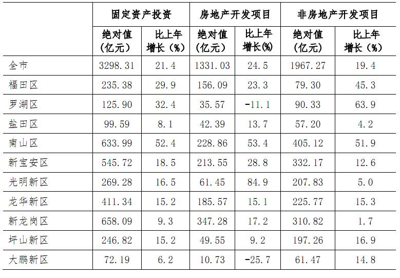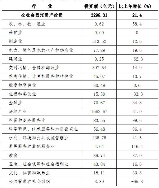 全年完成固定资产投资额3298.31亿元,比上年增长21.4%。其中,房地产开发项目投资1331.03亿元,增长24.5%;非房地产开发项目投资1967.27亿元,增长19.4%。