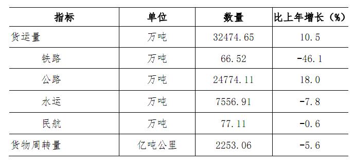 全年货物运输总量32474.65万吨,比上年增长10.5%。货物运输周转量2253.06亿吨公里,下降5.6%。