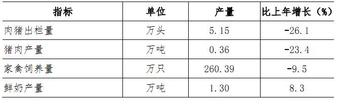 全年农作物播种面积72358亩,比上年减少1.9%,其中,蔬菜播种面积65249亩,下降4.0%。水果播种面积35474亩,下降3.7%。全年蔬菜产量6.30万吨,下降6.3%;水果产量0.40万吨,增长90.0%。主要畜产品产量见表4。