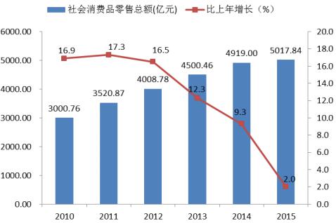 图9 2010-2015年社会消费品零售总额及增长速度