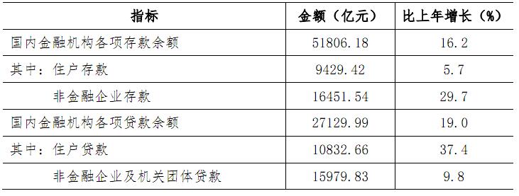 年末全市国内金融机构人民币存款余额51806.18亿元,比上年增长16.2%;国内金融机构人民币贷款余额27129.99亿元,增长19.0%。