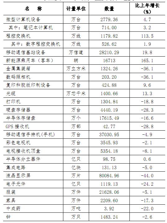 全年规模以上工业销售产值24529.39亿元,比上年增长0.9%。其中,出口交货值11239.20亿元,下降4.9%,占规模以上工业销售产值比重45.8%,比上年下降3.3个百分点。工业产品销售率97.9%,比上年提高0.1个百分点。主要工业产品产量见表6。