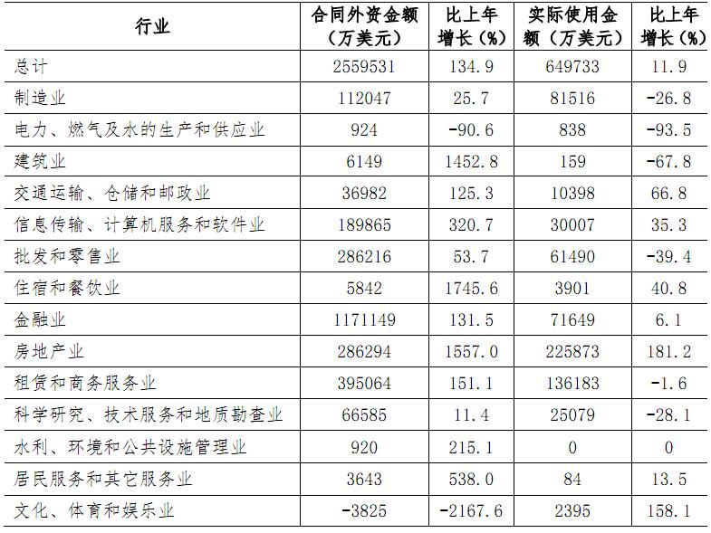全年新签外商直接投资合同项目3359项,比上年增长34.9%;合同外资金额255.95亿美元,增长134.9%;实际使用外商直接投资金额64.97亿美元,增长11.9%。