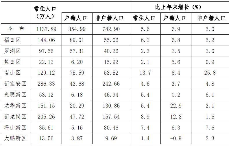 全市年末常住人口1137.89万人,比上年末增加60万人,增长5.6%。其中户籍人口354.99万人,占常住人口比重31.2%;非户籍人口782.90万人,占比重68.8%。全市各区人口分布见表2。