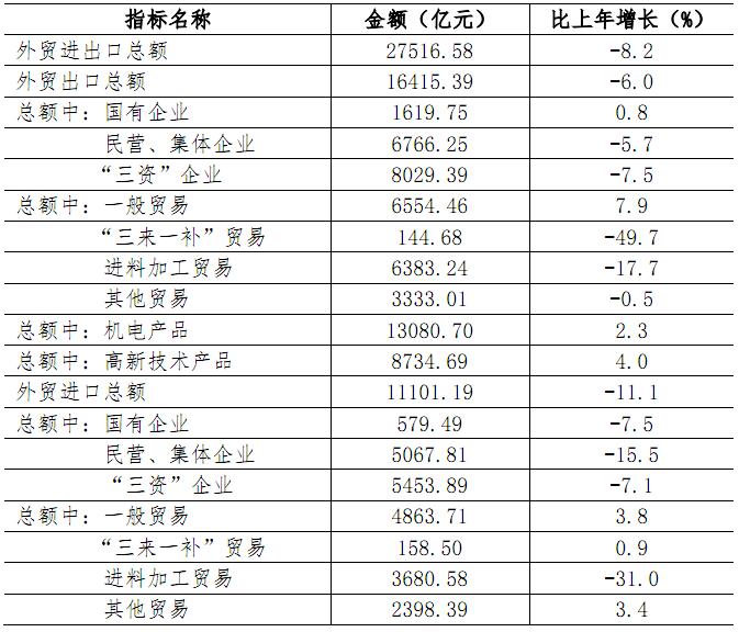 全年外贸进出口总额27516.58亿元,比上年下降8.2%。其中出口总额16415.39亿元,下降6.0%,分别占全国和广东省出口总额的比重为11.6%和41.1%;进口总额11101.19亿元,下降11.1%。出口总额连续二十三年居内地城市首位。