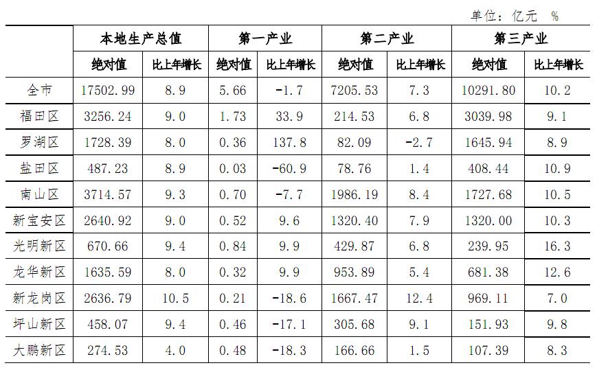 初步核算,全年本地生产总值17502.99亿元,比上年增长8.9%。其中,第一产业增加值5.66亿元,下降1.7%;第二产业增加值7205.53亿元,增长7.3%;第三产业增加值10291.80亿元,增长10.2%。第一产业增加值占全市生产总值的比重不到0.1%;第二和第三产业增加值占全市生产总值的比重分别为41.2%和58.8%。人均生产总值157985元,增长5.2%,按2015年平均汇率折算为25365美元。