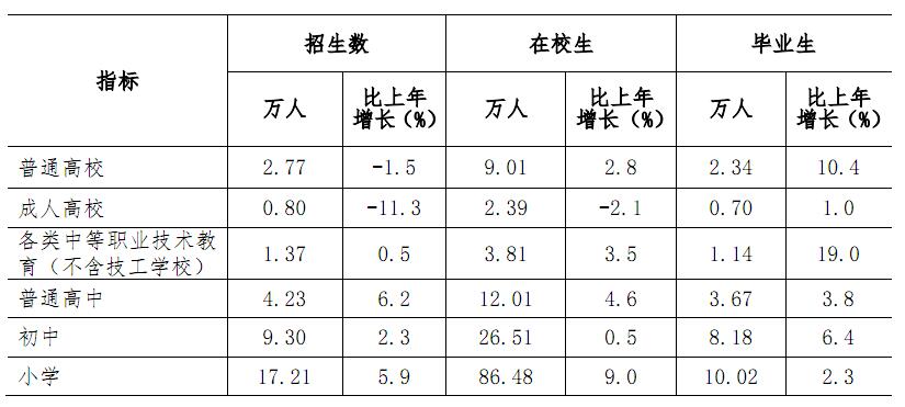 年末全市各级各类学校总数达2196所,比上年增加102所;毕业生41.69万人,招生数52.71万人,在校学生数187.68万人,分别增长7.9%、-0.5%和7.0%。年末全市有幼儿园1489所,增加87所;在园幼儿43.85万人,增长9.9%。有小学334所,增加3所;在校学生86.48万人,增长9.0%。有普通中学335所,增加10所;在校学生38.52万人,增长1.7%。学龄儿童入学率和小学毕业生升学率均保持在100%。全年普通高等学校12所,招生2.77万人,下降1.5%;毕业生2.34万人,增长10.4%;在校学生9.01万人,增长2.8%。