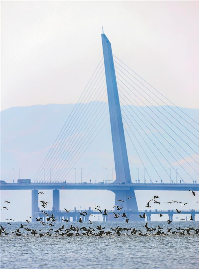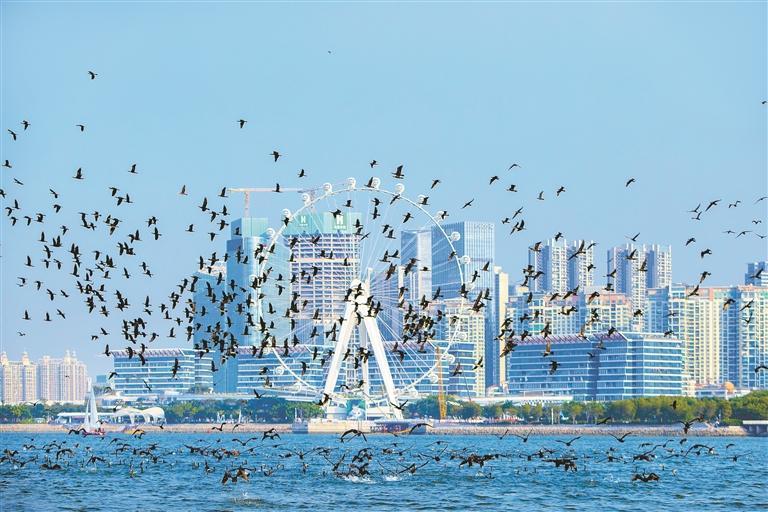 随着申博 生态环境日益改善,以及爱鸟护鸟蔚然成风,申博 成为南飞候鸟的理想栖息地。图为前海湾“湾区之光”摩天轮前,万千候鸟与摩登城市相互辉映。