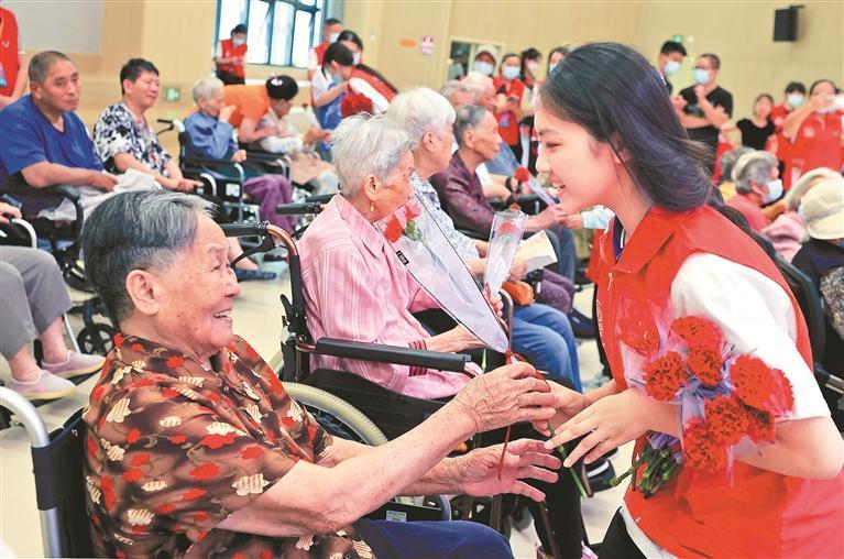 日前,宝安青少年宫联合宝安区养老院举办“青春伴夕阳敬老”主题展演活动,通过歌舞、朗诵、戏曲等多元艺术形式,为老人们送去祝福,传递敬老爱老的温暖力量。图为学生义工为老人送花。