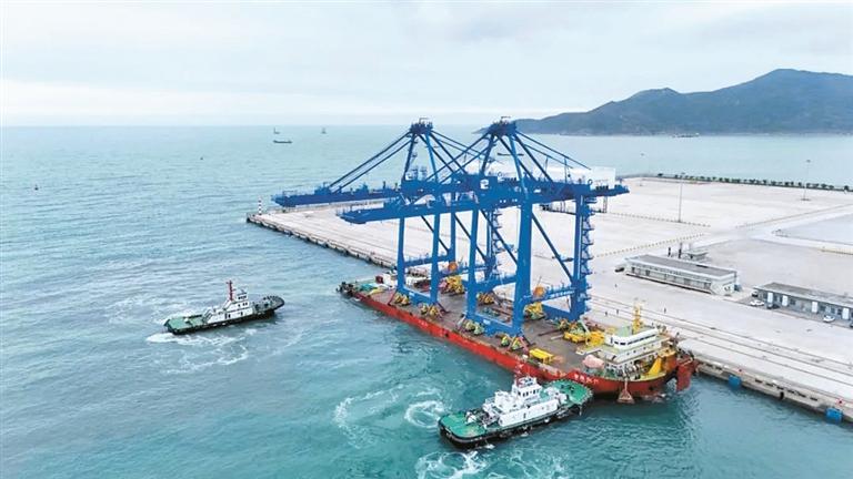 日前,小漠港二期项目首批两台岸边集装箱起重机(通称“岸桥”)乘大型运输船整机滚装,抵达深汕特别合作区小漠国际物流港。