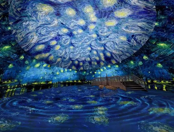 An exhibition room with immersive projections of Van Gogh’s “The Starry Night.”
