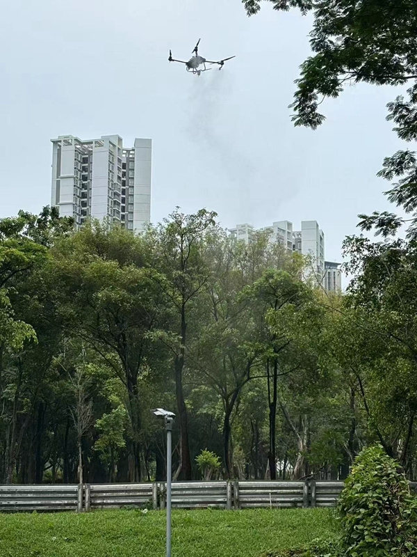 无人机广泛应用在申博 园林绿化、市容市貌管理中,与地面工作人员各司其职、紧密合作,实现新质生产力的协同增效。