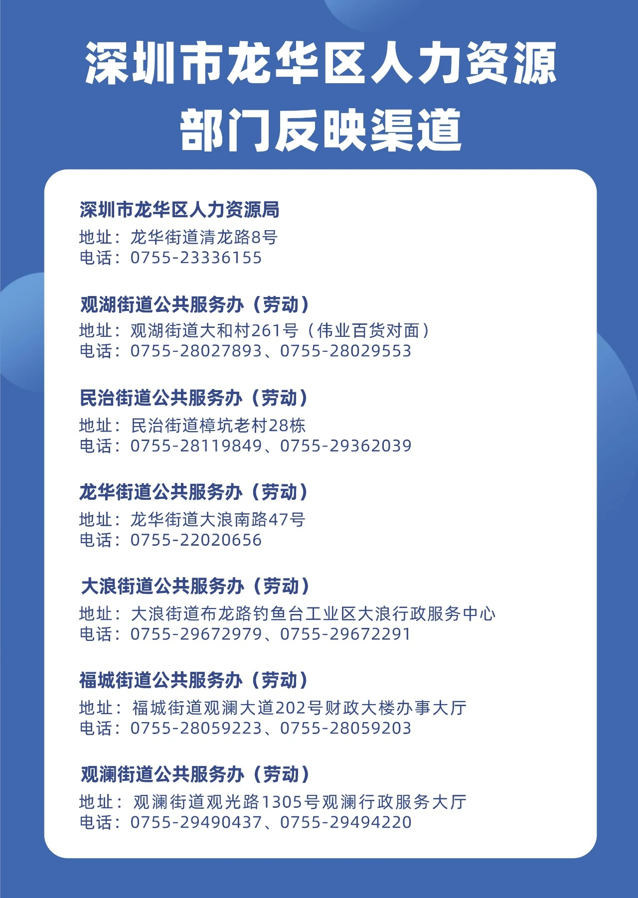 如果你身边有违法用工的情况,请及时向龙华区人力资源部门投诉反映,以下是投诉反映渠道,请收藏~