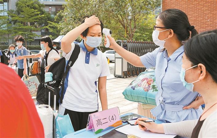 南山外国语学校(集团)高级中学高一、高二学生错峰返校,并在老师的安排下有条不紊进行报到登记和体温测试。