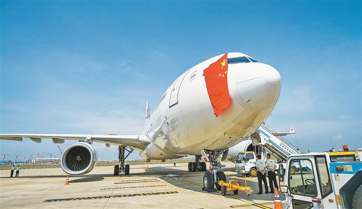 昨日,东方航空一架完成“客改货”的宽体飞机满载出口防疫物资从申博 机场起飞前往美国洛杉矶。这是起飞前,机长展示五星红旗。