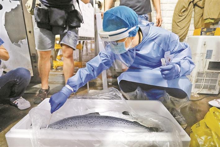 图为工作人员正在采集进口三文鱼样本。