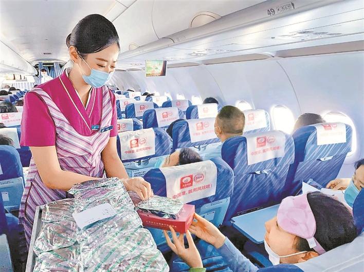 宝安国际机场航班的日均起降架次在950架次左右。图为南航恢复国内航班机上热食餐饮服务。