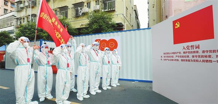 昨天上午,宝安福围社区一线工作人员收看“百年华诞”直播后精神振奋,党员先锋队的抗疫人员抗疫现场重温入党誓词。