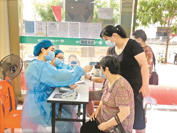 “爷爷,你把手机给我,我帮你查。”在桂园街道社康门口,志愿者打开吴爷爷的手机查看健康码,并询问他的年龄和身体情况,替他填写体检单。工作人员告诉记者,60至65岁老人无需提供近期体检单,但需无不适宜接种疫苗的病史;65岁以上老人则要出具体检报告或在社康参加免费体检。完成信息填写后,老人们还需量血压,血压过高或过低都不能接种疫苗。张奶奶陪着老伴等待第二次测量血压,“第一次量血压有点高,可能是因为天气热,歇一会再接着测。”