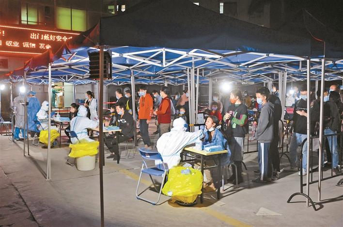 8日晚6时开始,龙岗区翠湖社区开始第二轮核酸检测,市民有序前往社区4个指定核酸采样点检测。数百名医务人员、志愿者、义工挑灯夜战,协助市民有序、安全完成核酸检测。