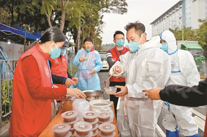 “今天是腊八节,我来给大家送点腊八粥,吃了腊八粥,事事都‘粥’全。你们辛苦了!”当天10时许,龙岗区园山街道银荷社区长者王阿姨和关阿姨就用车子拉着两大锅的腊八粥送到银荷社区核酸采样点。