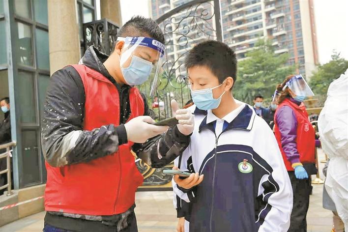 坂田街道属于此轮疫情防控的重点区域,连日来,街道义工联每天招募700余名志愿者援助一线。在街道12个社区、50余个核酸采样点,志愿者们检查居民核酸检测信息、维护秩序,为封控区管控区工作人员送物资,成为坂田抗疫战线不可或缺的力量。图为核酸检测点的志愿者查看辖区学生相关信息。
