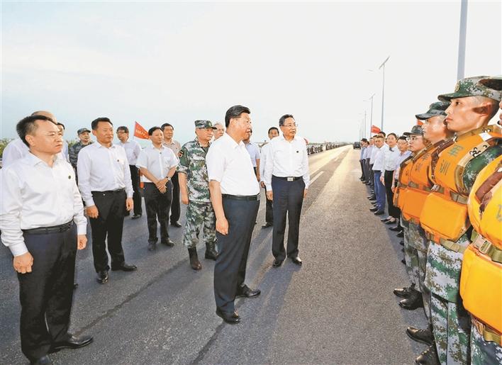 大堤上,习近平亲切看望慰问了在防汛抗洪救灾斗争中牺牲同志的家属、防汛抗洪一线人员、先进典型代表和参加抗洪抢险的部队官兵,并向全国奋战在防汛抗洪救灾一线的同志们表示诚挚的问候。他强调,今年入汛以来,南北方江河湖泊接连出现超警戒水位险情。广大干部群众和人民解放军、武警官兵坚决响应党和政府号召,发扬不怕累苦、不怕疲劳、不怕牺牲的精神斗志,坚守在防汛抗洪救灾第一线,涌现了许多先进典型和感人事迹,展现了中国人民众志成城、顽强拼搏、敢于胜利的英雄气概,书写了洪水无情人有情的人间大爱。党和人民感谢你们!