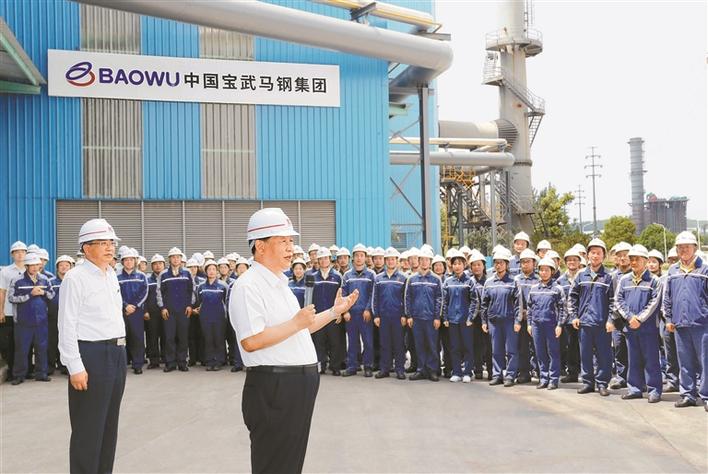 马鞍山市因钢而设、因钢而兴。习近平来到中国宝武马钢集团,了解企业生产经营情况,察看重点产品展示。随后,习近平走进优质合金棒材车间,察看加热炉、初轧机、中轧机等运行情况。车间外,企业劳动模范、工人代表看到总书记来了,热烈鼓掌。习近平亲切地同大家打招呼。他指出,疫情发生以来,马钢克服困难,率先复工复产,上半年产量和营收同比实现“双升”。要抓住深化国有企业改革和推动长三角一体化发展的重大机遇,加强新材料新技术研发,开发生产更多技术含量高、附加值高的新产品,增强市场竞争力。劳动模范是共和国的功臣,要大力弘扬劳模精神。