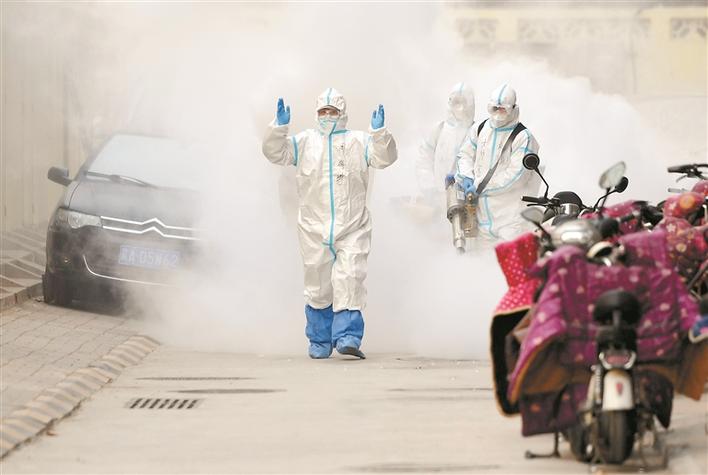 1月20日,工作人员在石家庄市裕华区河北城建学校家属院开展消杀作业。近日,河北省石家庄市对以中高风险地区为主的全市域开展全面消毒。
