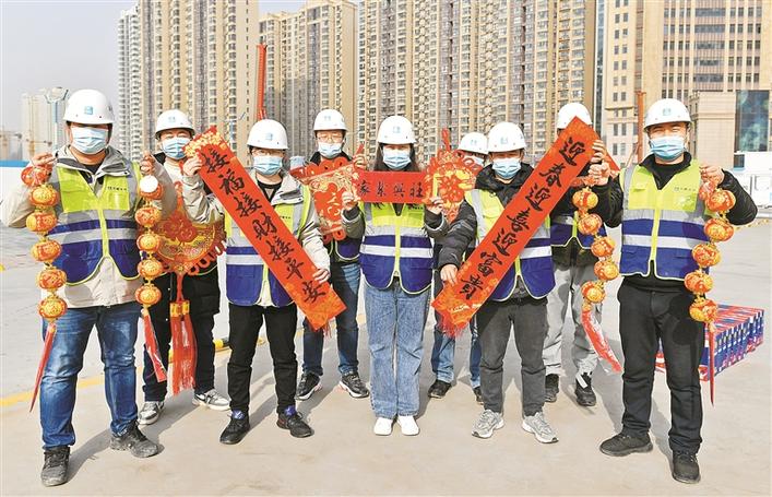 1月26日,在西安市东三爻安置小区建设项目,就地过年的项目管理人员展示领取到的节日饰品。