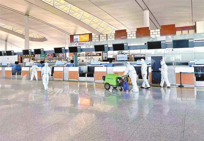 日前,工作人员在南京禄口机场T2航站楼内进行消杀。