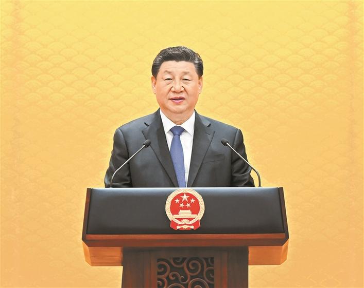 2月5日中午,国家主席习近平和夫人彭丽媛在北京人民大会堂金色大厅举行宴会,欢迎出席北京2022年冬奥会开幕式的国际贵宾。这是习近平在宴会上发表致辞。
