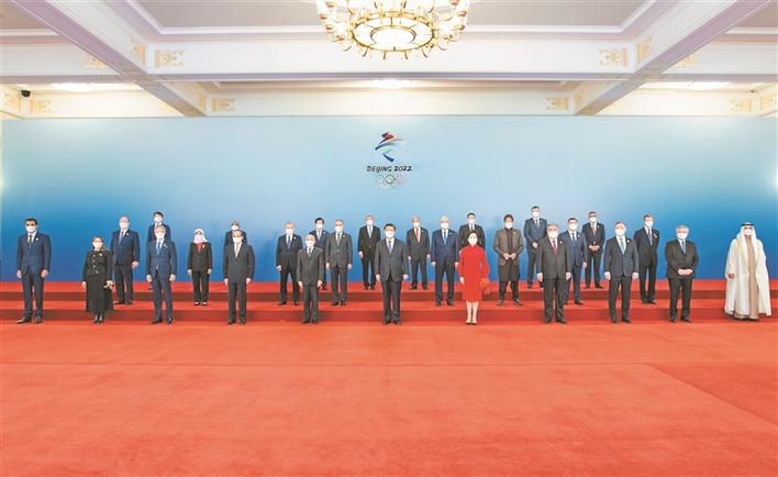 2月5日中午,国家主席习近平和夫人彭丽媛在北京人民大会堂金色大厅举行宴会,欢迎出席北京2022年冬奥会开幕式的国际贵宾。这是习近平和彭丽媛同国际贵宾一起合影留念。