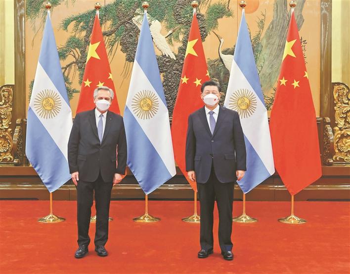 习近平强调,中方愿同阿方加强高层交往和治国理政经验交流,相互支持对方在维护主权、安全、发展利益上的正当主张。中方愿同阿方共享发展机遇,助力阿根廷扩大出口和产业升级。双方要高质量共建“一带一路”,充分发挥互补优势,落实好水电、铁路等现有重大项目,深化贸易、农业、能矿、基础设施、投融资、抗疫等领域合作。中阿航天、海洋等合作为人类探索星辰大海作出积极贡献。双方要努力打造数字经济、绿色发展等合作新亮点。我愿同你共同宣布启动2022中阿友好合作年,积极开展文化、教育、体育、媒体、青年、地方等领域交流,便利人员往来,促进民心相通。
